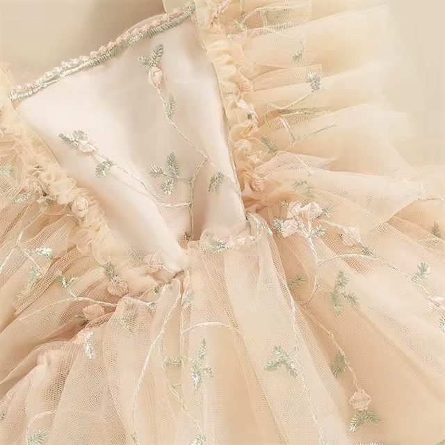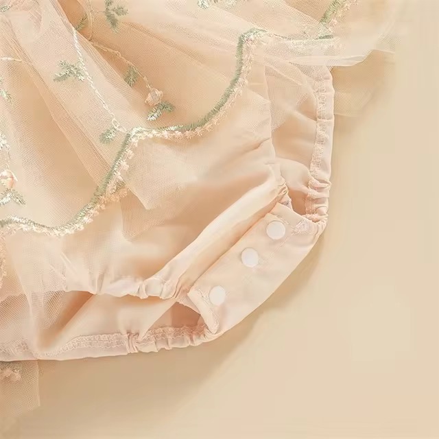 Aurora Romper – A dreamy blend of soft tulle layers and delicate floral embroidery, crafted to make your little one sparkle with charm. Perfect for special moments and timeless memories.